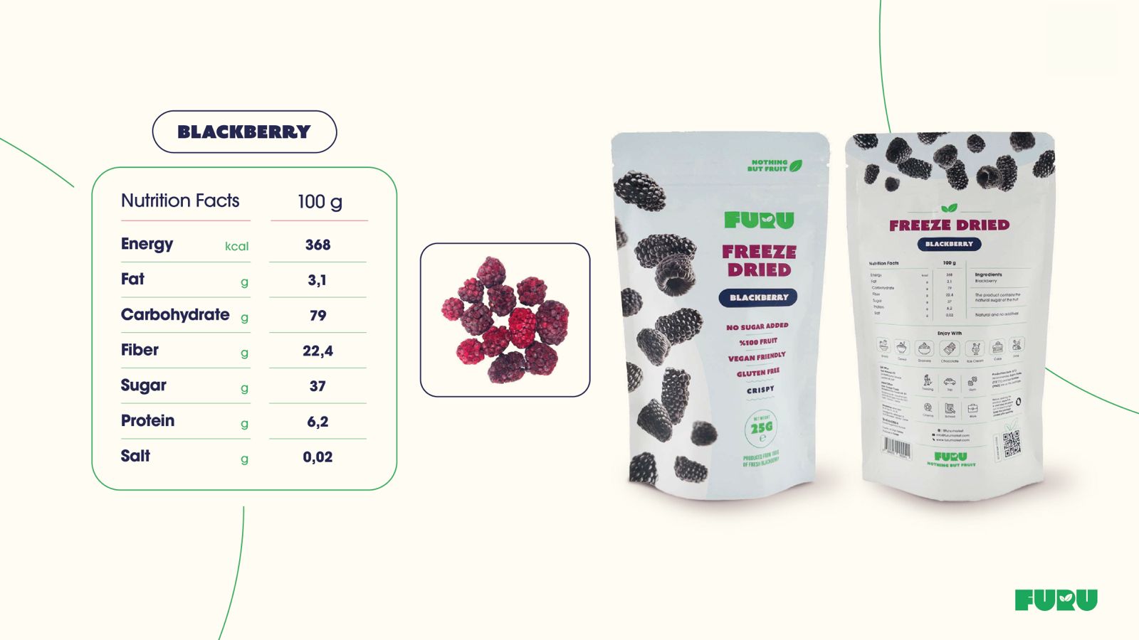 FURU Freeze Dried Blackberries are made from fresh, handpicked blackberries that are freeze dried to preserve their naturally sweet, juicy flavor and vibrant color.