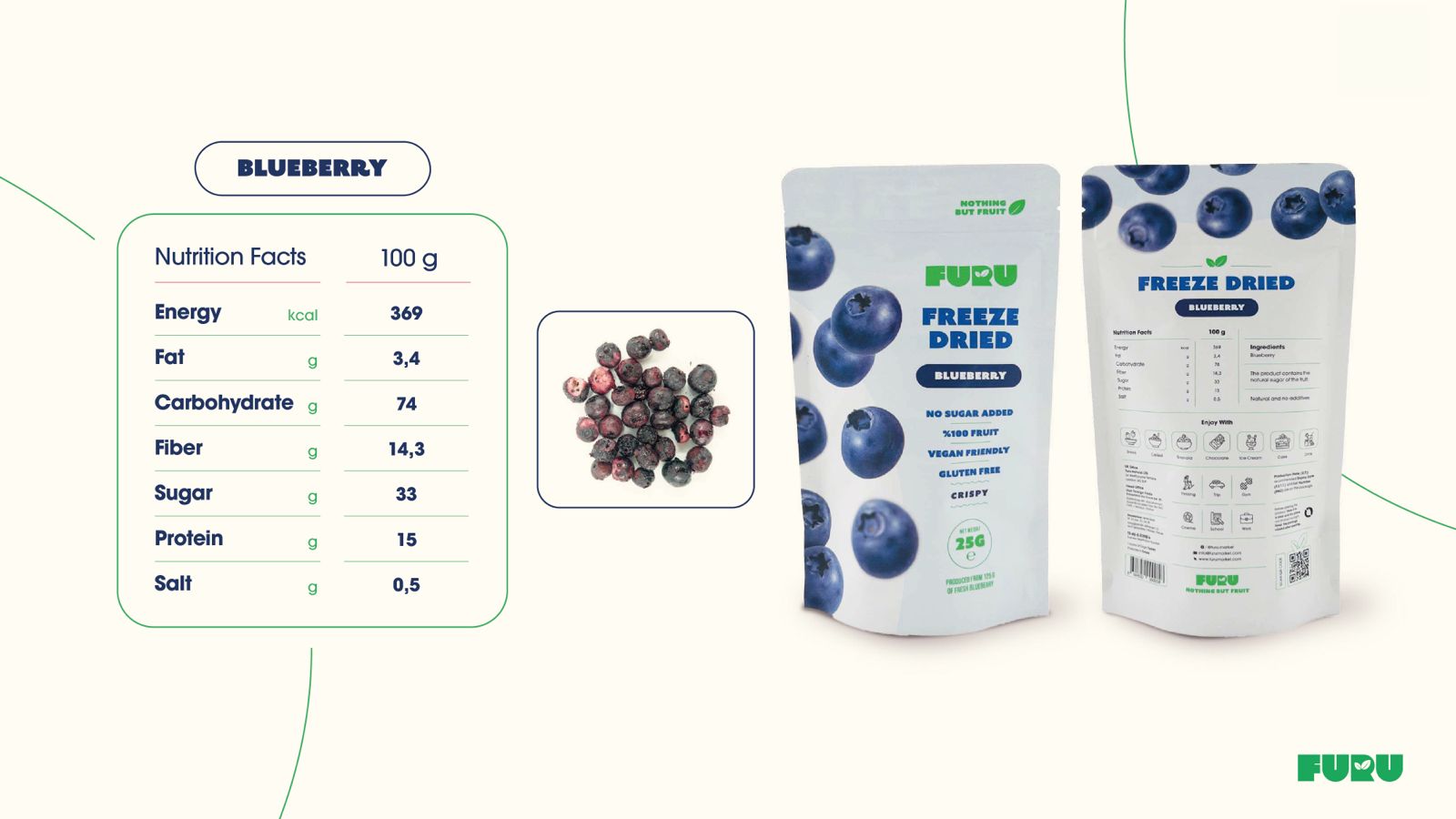FURU Freeze Dried Blueberries are made from the finest blueberries, carefully selected at peak ripeness and freeze dried to preserve their natural sweetness, antioxidants, and bright blue color.